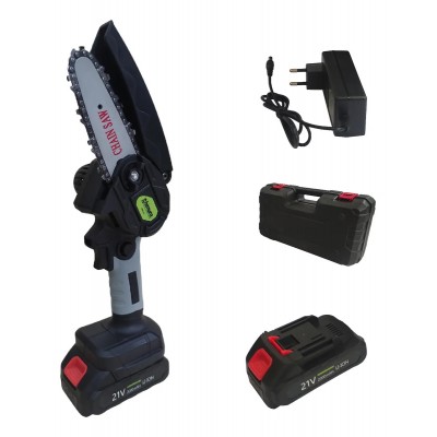 Incluye: 2 baterías de litio 21V, 2 cadenas, cargador, estuche plástico, destornillador